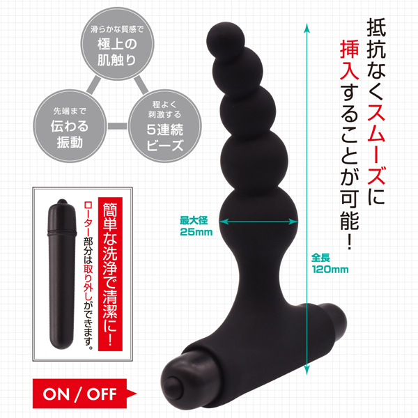 お尻への挿入に慣れていない方にも安心な全長120mm、最大幅25mmの小型プラグ。ポコポコとした刺激が楽しめる球体が5つ連なったビーズデザイン♪肌触り滑らかなシリコン素材を使用しているので、抵抗なくスムーズに挿入していただけます。底部は取り外し可能なローター付きで凹凸刺激と同時に振動も味わえる◎
