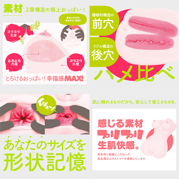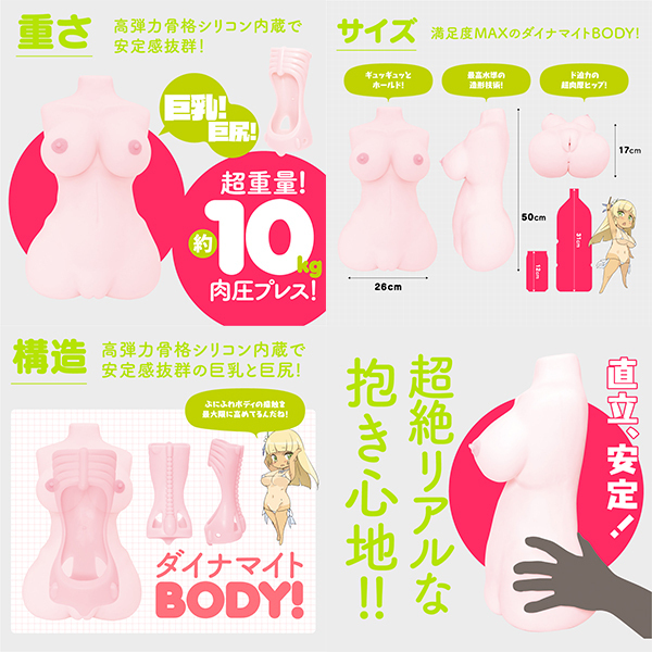 超重量約10kgダイナマイトボディ!高弾力骨格シリコン内蔵で安定感抜群の巨乳と巨尻!リアルな抱き心地を完全再現しました!とろとろ内層×ぷりぷり外層の2層構造で揉み心地にもこだわった極上おっぱいは耐久性抜群!夢のパイズリに幸福感MAX!ずっといじっていたくなる少し硬めの素材で成型されたコリコリ乳首は触りすぎ注意!?ゾリゾリ6連巨大ヒダの前穴とキツキツうごめく巨大イボの後ろ穴を贅沢ハメ比べ!