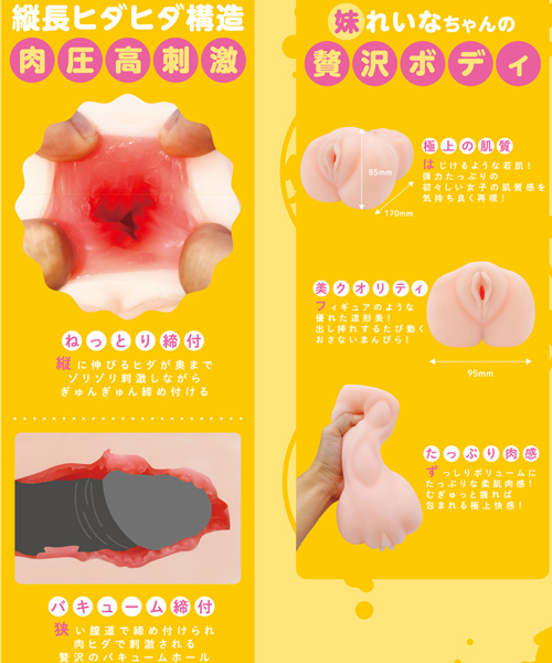 重さは約900g!柔らかなハリのある初々しい大ボリュームボディに仕上げました♪ずしっとしたボディ×バキューム感抜群のキツキツ膣道に加えて、縦に伸縮する肉ヒダ&最奥にランダム配置されたイボで徹底刺激!ぽっこり膨らんだ肉厚壁の極上刺激を是非ご体感あれ♪ローション付属
